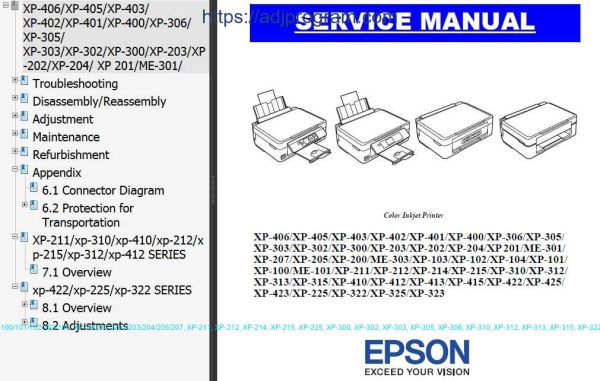 This Epson XP-100, XP-101, XP-102, XP-103, XP-104, XP-200, XP-201, XP-202, XP-203, XP-204, XP-205, XP-207, XP-211, XP-212, XP-214, XP-215, XP-225, XP-300, XP-302, XP-303, XP-305, XP-306, XP-310, XP-312, XP-313, XP-315, XP-322, XP-323, XP-325, XP-400, XP-401, XP-402, XP-403, XP-405, XP-406, XP-410, XP-412, XP-413, XP-415, XP-423, XP-425, ME-101, ME-301, ME-303 service manual describes the basic functions, theory of electrical and mechanical operations, maintenance procedures, and repair of the printer.